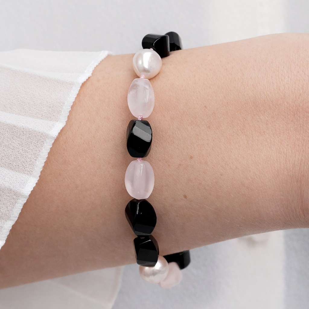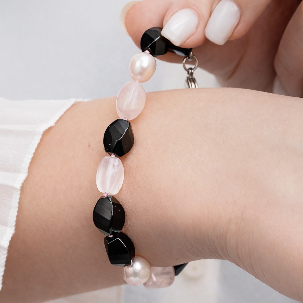 Apyrankė su rožiniu kvarcu, oniksu ir perlais