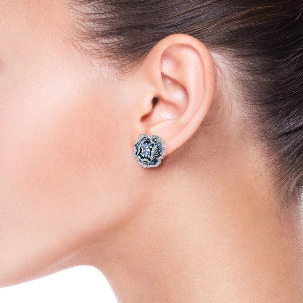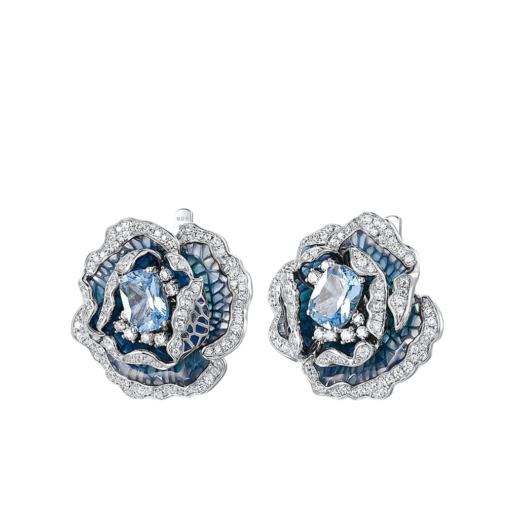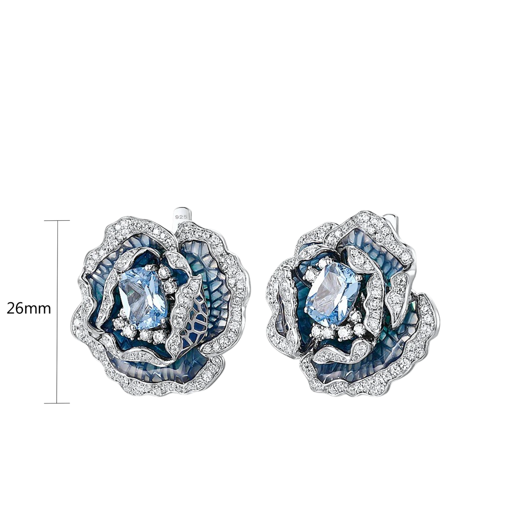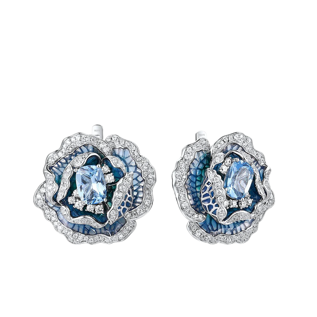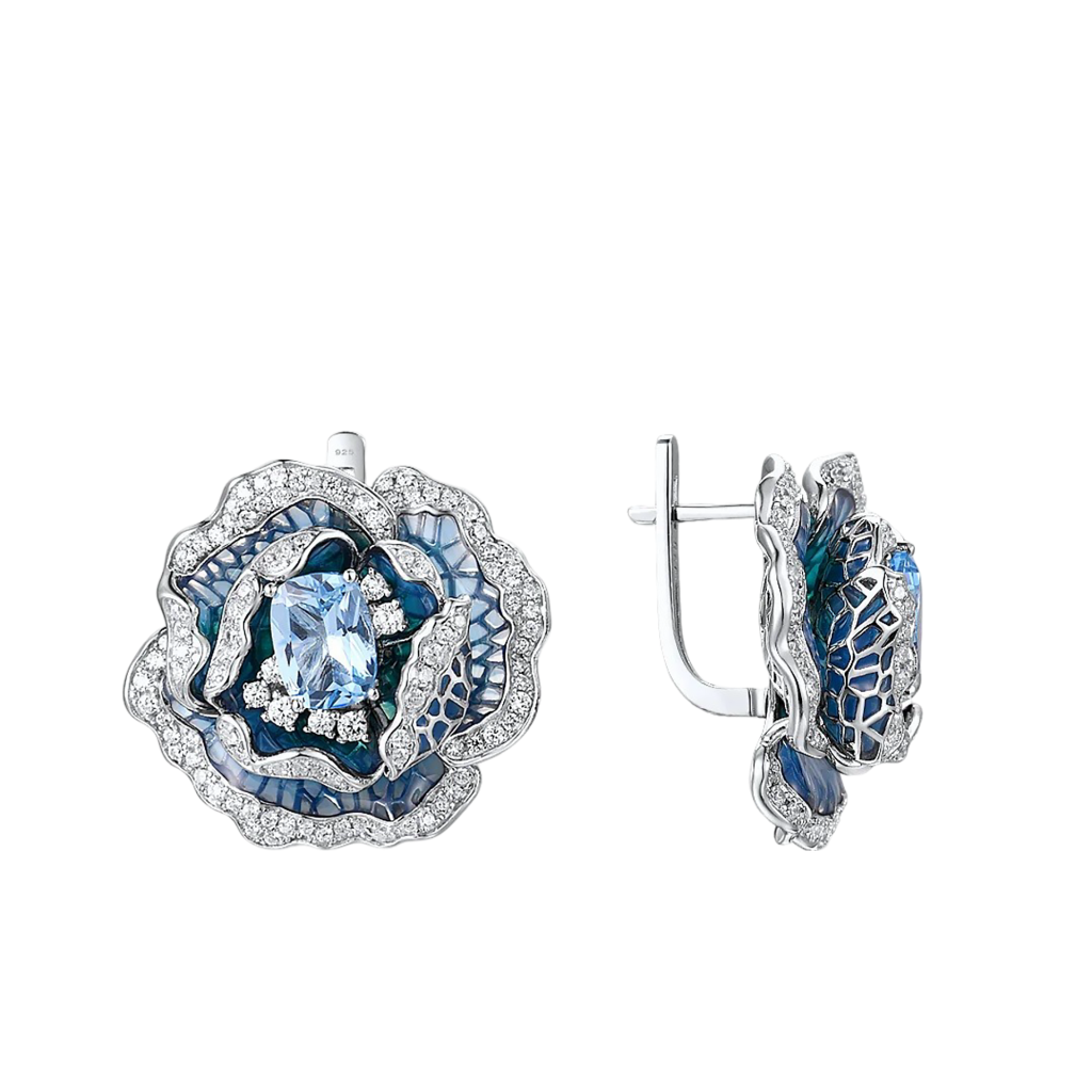 Sidabriniai auskarai su cirkoniais, emale ir špineliais "Gėlė"