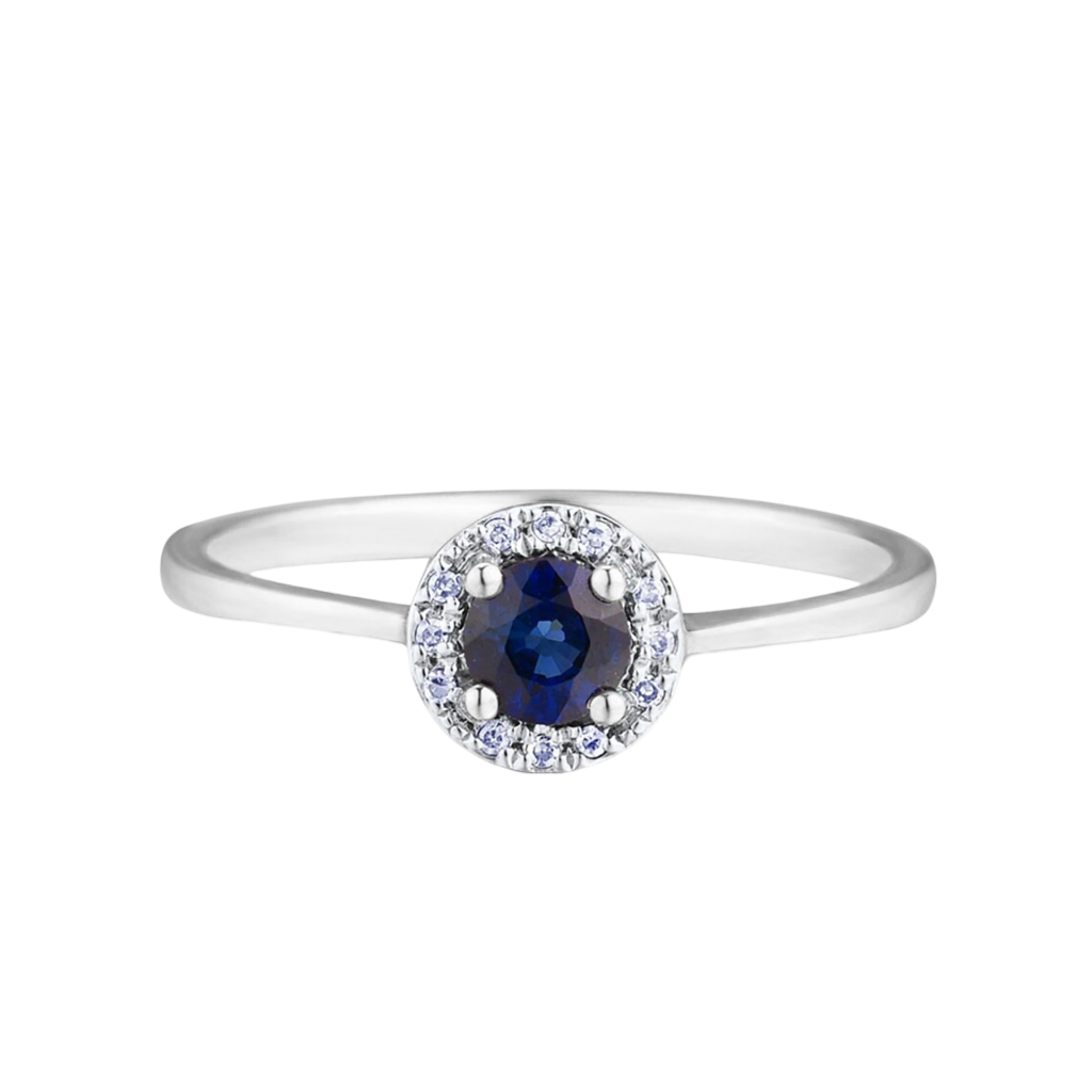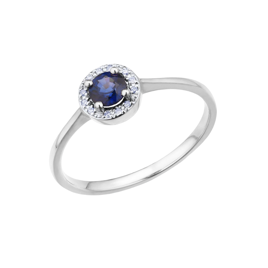 Balto aukso žiedas su deimantais ir safyru